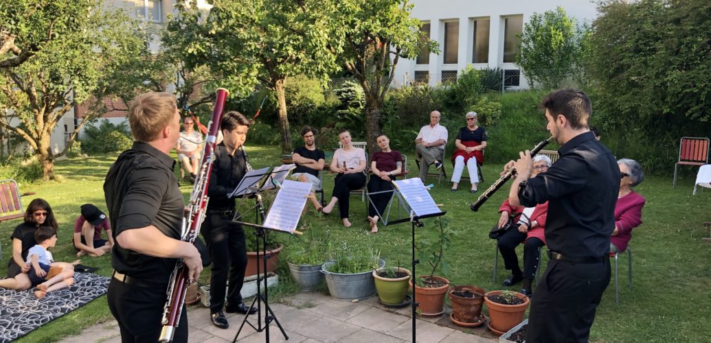 Ich hatte des Vergnügen, ein Holzbläser-Trio mit Benedikt Schobel, Marc Lachat und Aron Chiesa in Bettingen zu hören. Ein exklusives Erlebnis für ein generationenübergreifendes Publikum aus der umliegenden Nachbarschaft. Das Konzert hat erste Wiedersehen seit dem Lock-Down ermöglicht.